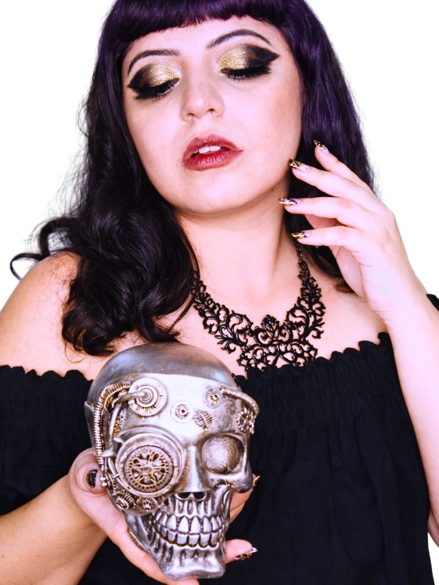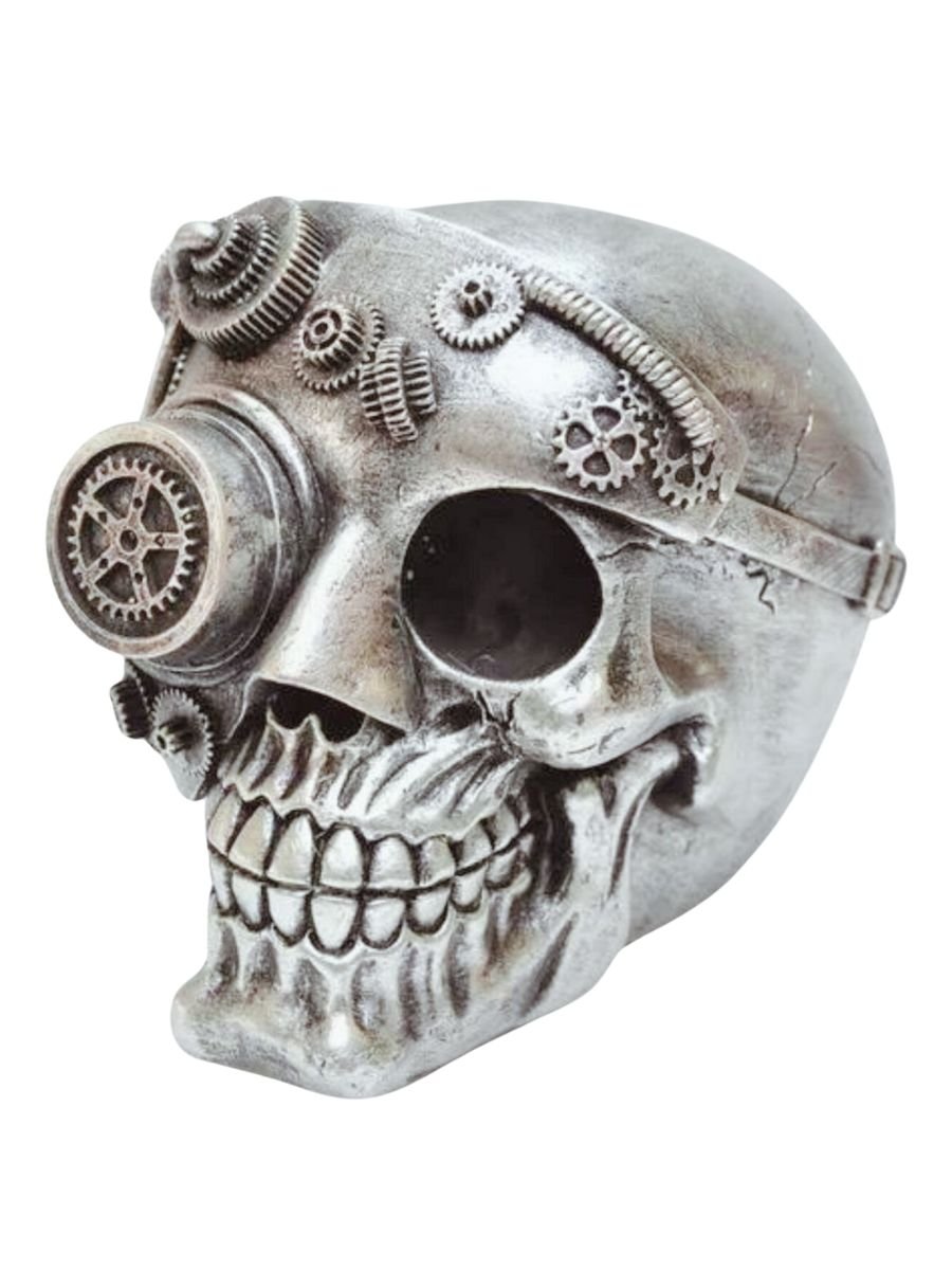 Caveira Decorativa Steampunk Cyborg – Resina Prateada