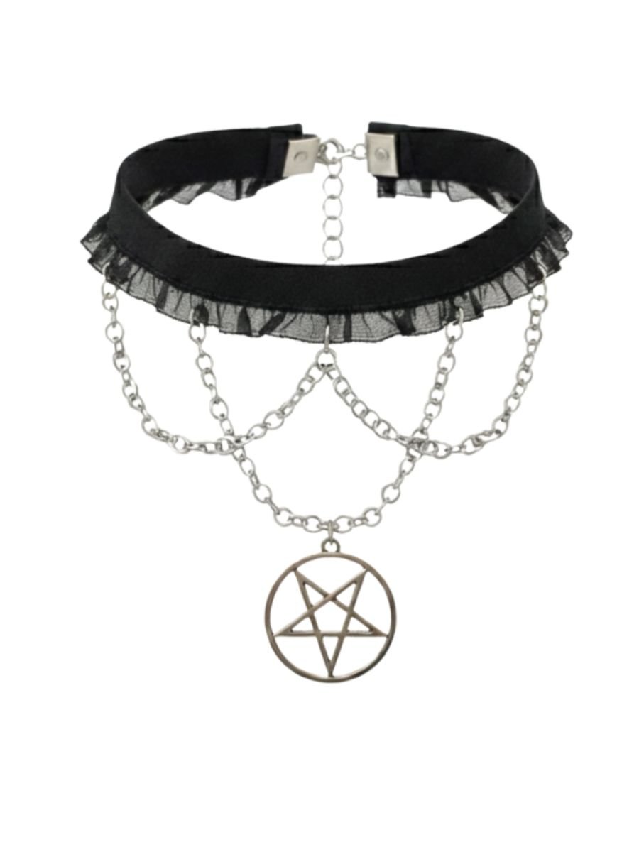 A Gargantilha Choker Dark Witch é um acessório criado para mulheres que carregam a magia na essência e a noite na alma. Seu design une a delicadeza da fita aveludada com o romantismo do tule, contrastando com o impacto visual das correntes metálicas em camadas e o poderoso pingente de pentagrama — símbolo de proteção, força e conexão espiritual.