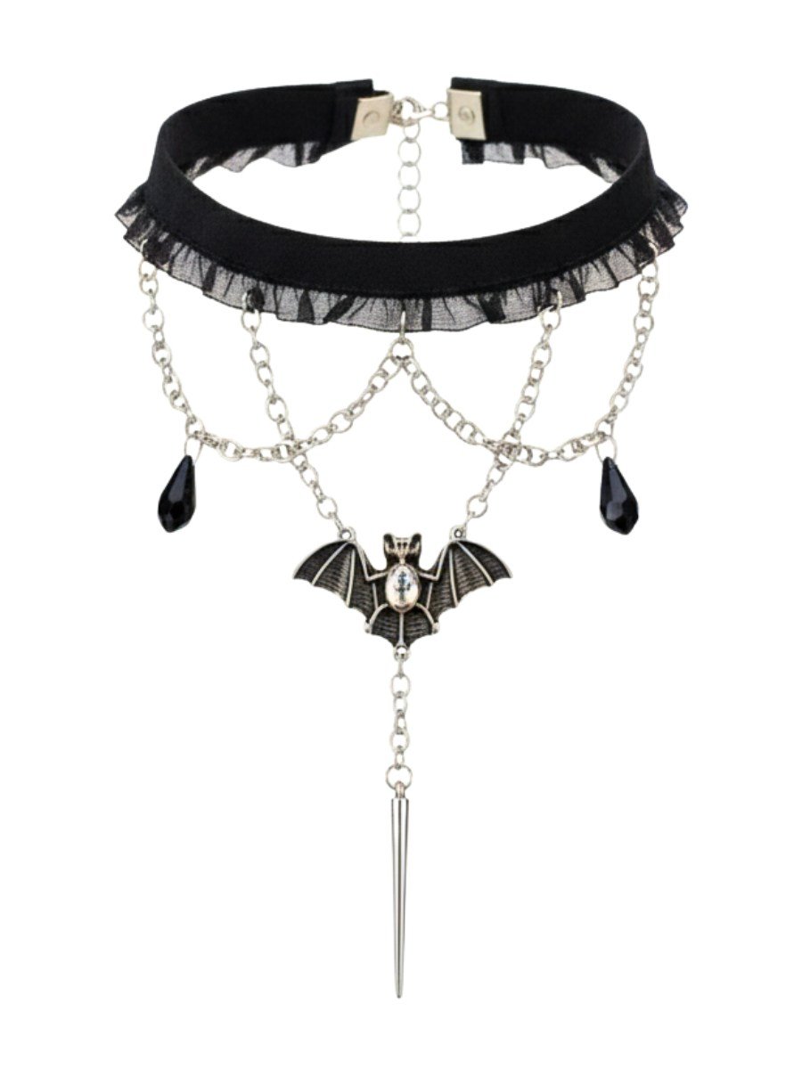A base em fita aveludada preta com delicado detalhe com um babado tule cria contraste perfeito com as correntes metálicas drapeadas, que caem de forma simétrica sobre o colo. No centro, o pingente de morcego simboliza poder, transformação e imortalidade, enquanto as gotas negras laterais e a lança vertical final trazem imponência, dramaticidade e movimento à composição.