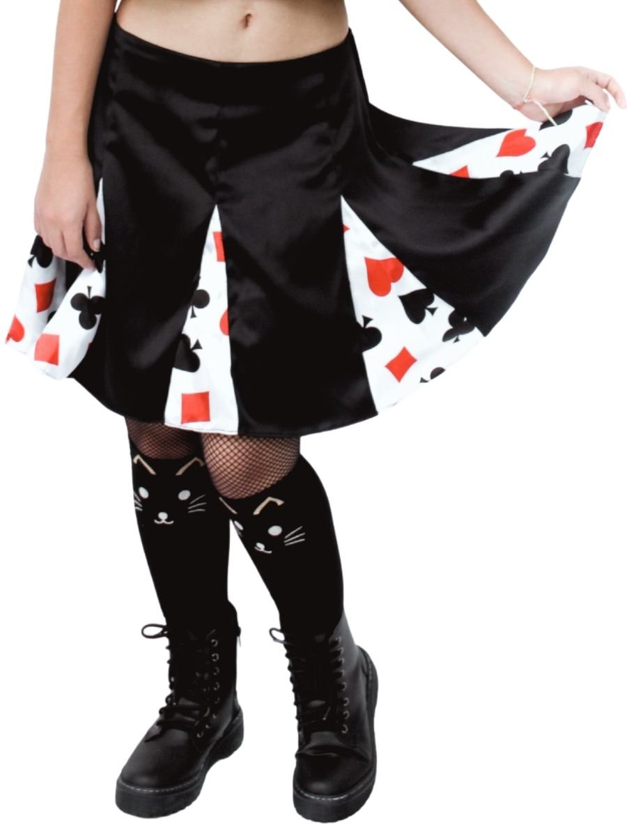 Inspirada no universo lúdico de Alice no País das Maravilhas, a Saia Nesgas Baralho é um convite à imaginação. Com design exclusivo da Trapézia, ela combina o charme da modelagem rodada com um toque irreverente: oito nesgas estampadas com naipes de baralho, referência direta à icônica Rainha de Copas.