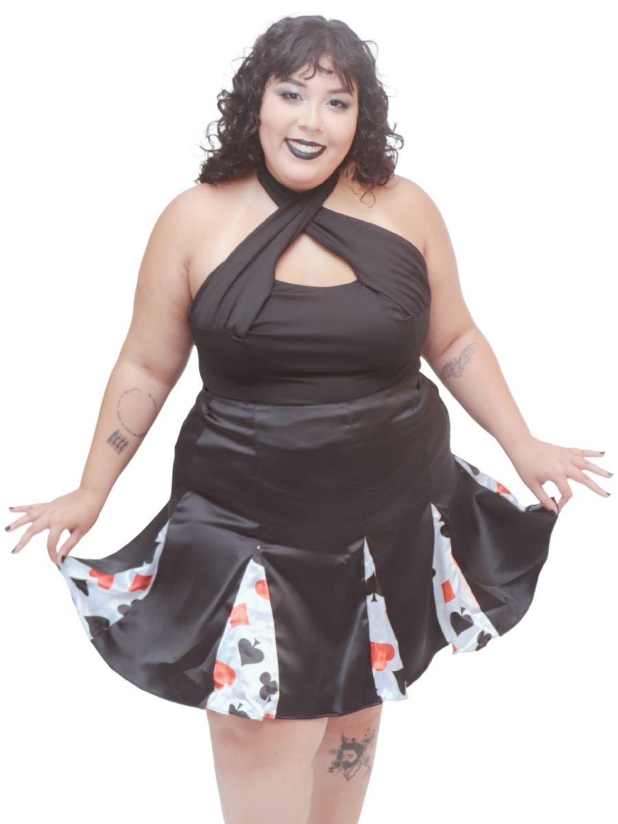 Inspirada no universo lúdico de Alice no País das Maravilhas, a Saia Nesgas Baralho é um convite à imaginação. Com design exclusivo da Trapézia, ela combina o charme da modelagem rodada com um toque irreverente: oito nesgas estampadas com naipes de baralho, referência direta à icônica Rainha de Copas.