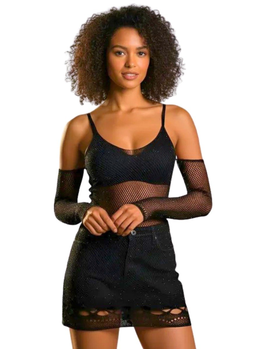 Confeccionado em malha tipo arrastão ultra maleável com aplicação de pequenas pedrinhas na peça, o vestido possui um tipo de renda com tramas vazadas que revelam o corpo com elegância e ousadia. O comprimento curto e justo valoriza a silhueta, enquanto as mangas separadas no estilo "sleeve warmers" acrescentam atitude e autenticidade.
